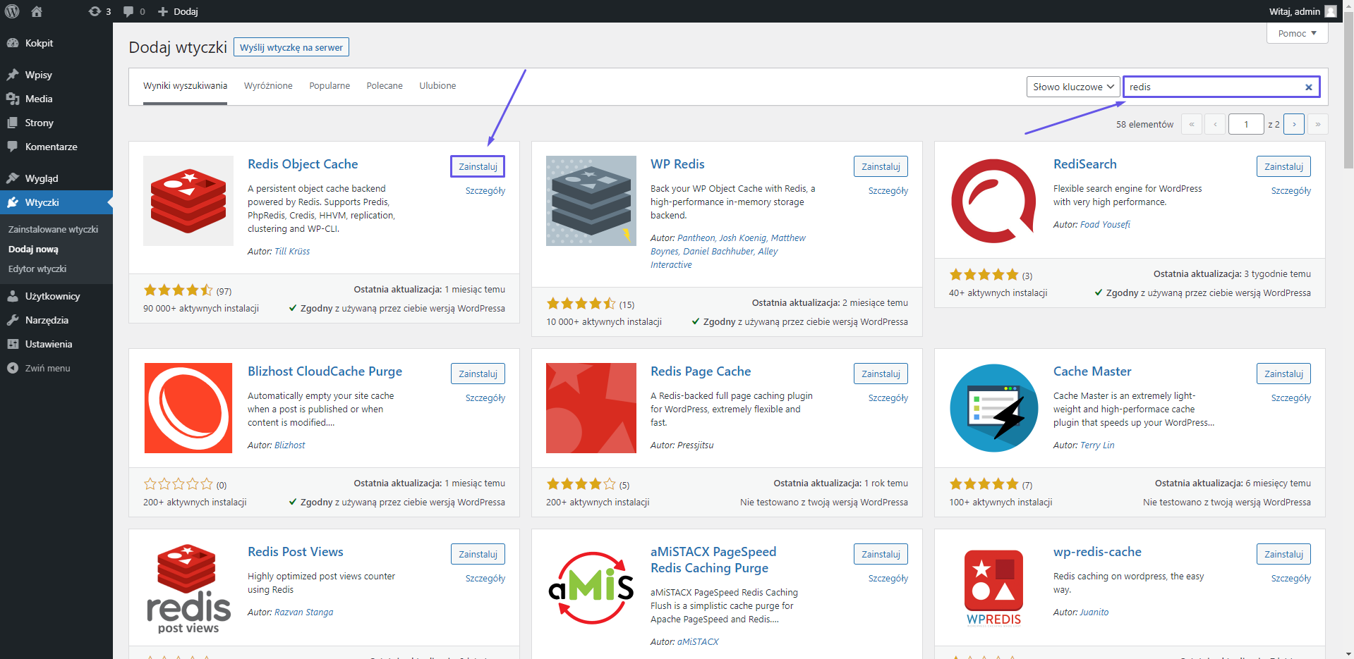 W polu wyszukiwarki wpisujemy redis, a nast臋pnie klikamy enter. Po znalezieniu wtyczki Redis Cache, klikamy w przycisk Zainstaluj, a nast臋pnie W艂膮cz.